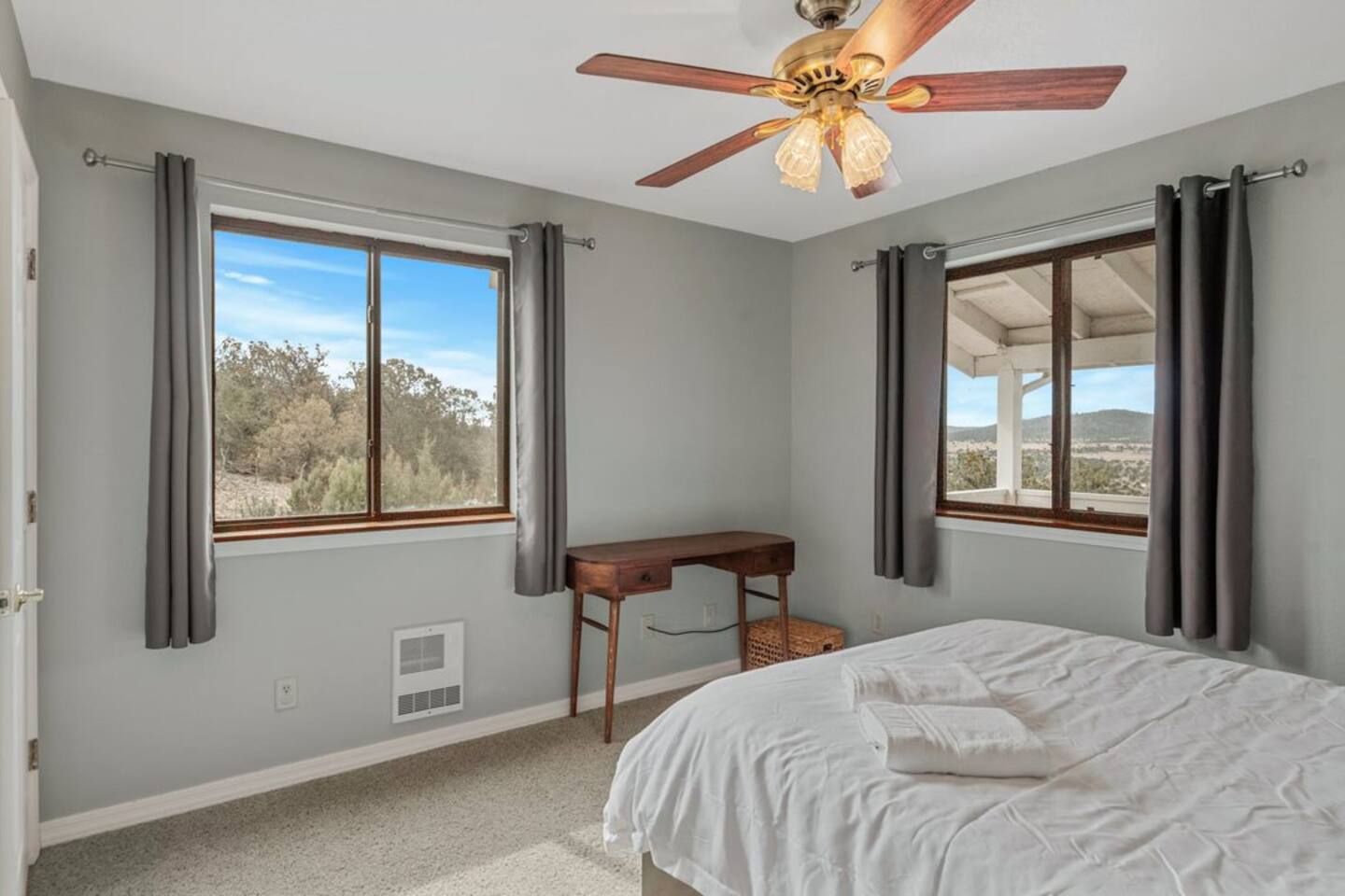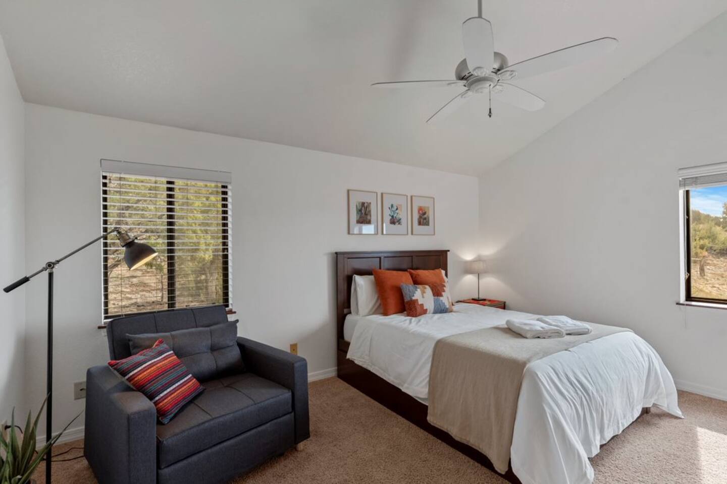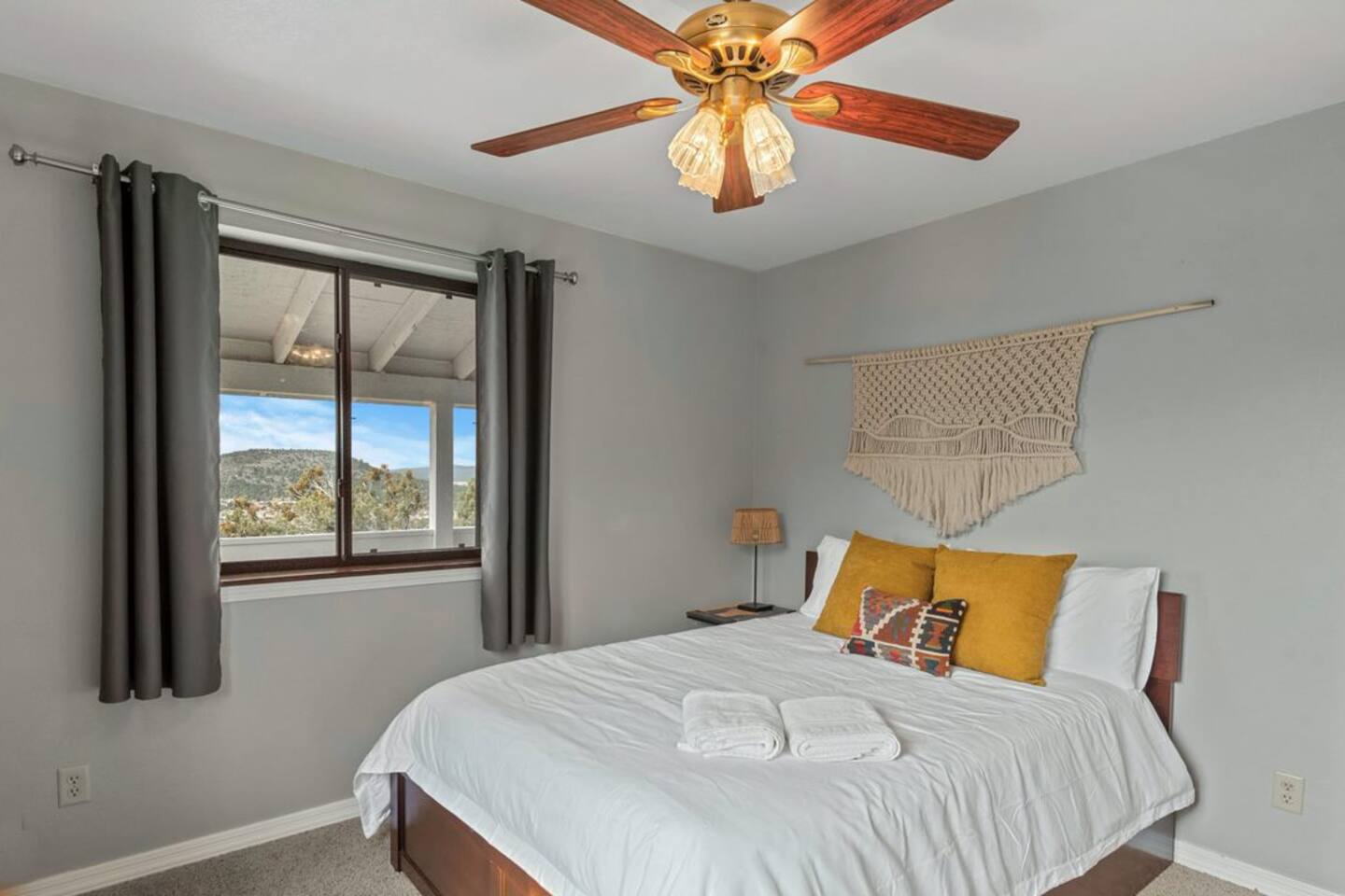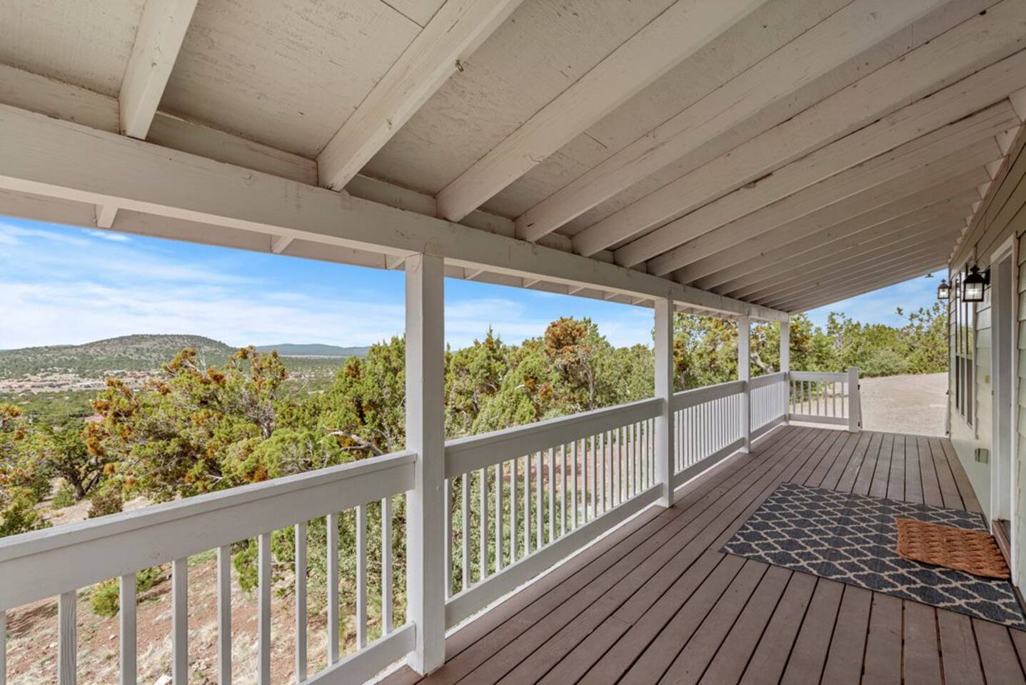 2 bedrooms (a private downstairs room and an upstairs loft) with plenty of room to comfortably sleep 7. Each room has a queen size bed with a twin trundle. The upstairs loft has an additional pull out sofa bed. Enjoy the fully equipped kitchen, comfortable family room with a great big sofa, large dining table, and a gas fireplace – all while taking in the sweeping views of the valley below. Although there is TV and Wi-Fi, you might prefer to gather on the front porch and pull up a front-row seat to one of Northern Arizona’s breathtaking sunsets, a night of star-filled skies, or watch the rain and snowfall on the surrounding hills. When you’re ready to leave the indoor comforts of home, you can easily venture out to explore all the activities this area has to offer. A 40 minute drive to Grand Canyon National Park, 35 minutes to the city of Flagstaff, and a short 20 minutes to downtown Williams, historic route 66 shops and restaurants, and Bearizona Wildlife Park.